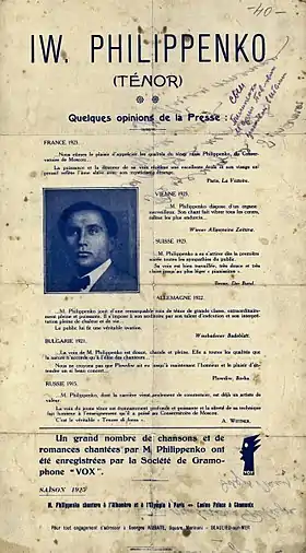 Далі на еміграції у жив у Парижі. Виступав із сольними концертами в залі на 77, rue Pigalle, 9-е (1923) і залі Malakoff (1924), на суботниках «Російської газети» (1923—1924), у концертних програмах Російського літературно-артистичного гуртка (1925), у театрі Олімпія (1924—1925), а також гастролював у Мілані з трупою «Російські маски» у театрі Тріанон (1924)[12]. Саме у Франції закріпилося написання його імені, яке він використовуватиме надалі Iwan Philippenko[13][14].