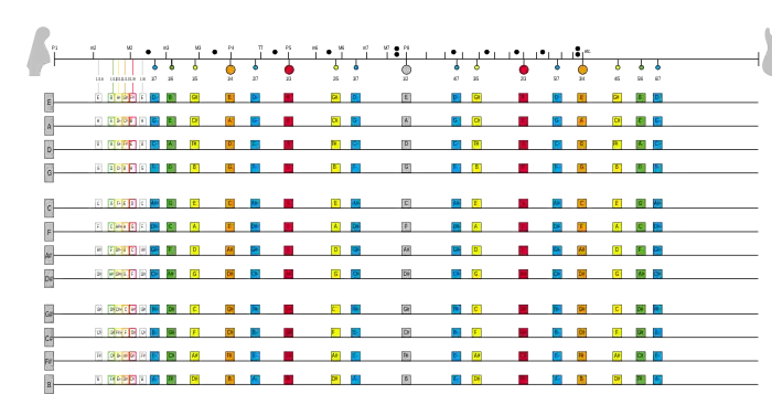 Діаграма нижче ілюструє можливість видобування флажолетів від певного основного тону на струнному інструменті. Чорні горизонтальні лінії ілюструють струну, настроєні на висоту, позначену літерою ліворуч. Кольорові квадрати вздовж струни означають означають можливість отримання наступних флажолетів, що можна видобути приглушенням струни у місці, вказаному кольоровим квадратом; висота отриманого в такий спосіб флажолету подана в кожному квадраті. Надписи на осі на діаграмі зверху означають позицію на струні, на якому струна приглушується. Цифри внизу означають позицію відносно її повної довжини, вгорі - відносно музичного інтервалу, що утворюється між висотою відкритої струни і висотою відповідного звуку при звичайному її притисканню. Наприклад, блокуючи коливання струни E (в горі діаграми) в точці означеній 1/2 (P8, сірий квадрат) отримуємо звук E октавою вище від основного тону.