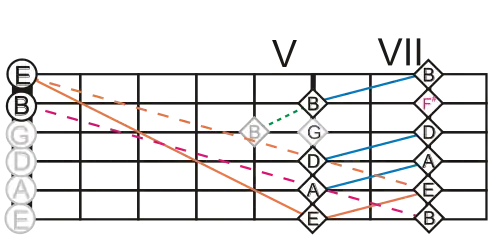 Розташування квартових та квінтових натуральних флажолетів на гітарі показано діаграмою нижче. Римськими цифрами - показано номер ладку, біля якого струна приглушуються, букви в кружечках - відкриті струни, в ромбах - звуки, що утворюються.