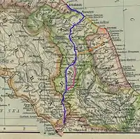 Схема Фламінієвї дороги. Червоним кольором відображена Via Flaminia nova.