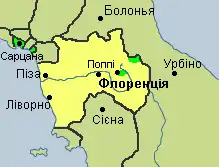 На з'їзді в Сан-Дженезіо у 1197 році тосканські міста (Флоренція, Піза, Сієна, Лукка, Ареццо і Вольтерра) уклали між собою союз, поділивши територію колишнього маркграфства на сфери впливу. У результаті в Тоскані розвернулася громадянська війна між провідними міськими комунами, з одного боку, і феодалами та дрібними населеними пунктами сільської місцевості, з іншого, що завершилася встановленням у Тоскані влади кількох міст-держав. Після завоювання своїх контадо в першій чверті 13 століття міста вступили в конфлікти одне з одним. Для Флоренції найголовнішим супротивником стала Сієнська республіка, чия експансія розвивалася у напрямі флорентійського контадо. Боротьба Сієни і Флоренції за два невеликі міста Монтепульчано і Монтальчіно продовжувалася із змінним успіхом кілька століть. Флорентійцям в 1171 році вдалося укласти союз з Пізою — найбільшим морським портом Тоскани — і добитися того, що флорентійські товари перевозились на кораблях пізанців за такими ж митними ставками, що і пізанські. Проте на початку 13 століття посилення Флоренції в Центральній Тоскані привело до складання двох ворожих блоків: Флоренція і Лукка проти союзу Пізи і Сієни. Останні традиційно орієнтувалися на імператора, що привело Флоренцію в табір Папи Римського. Це поклало початок боротьбі гвельфів і гібелінів в Тоскані.
