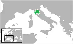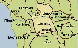 | Ареццо – Вольтерра – Гроссето – Каррара і Масса – Лукка – герц. Лукка – Піза – Пістойя – Прато – Пьомбіно – Сієна – Тосканска марка – вел. герц. Тоскана – Флоренція – Фьовічино – Етрурія |