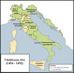 Зовнішня політика Флоренції цілком контролювалася і направлялася Козімо Медічі. Головну загрозу республіці являло Міланське герцогство Філіппо-Марії Вісконті. Уклавши союз з Венецією і найнявши велику армію кондотьєрів, флорентійські війська завдали в 1440 році поразки міланцям при Аньярі. Це дозволило витіснити Вісконті з Тоскани і приєднати верхів'я Арно з містом Поппі. У боротьбі за престол Мілана, що послідкувала за цим, Козімо активно підтримував Франческо Сфорца, що після коронації останнього герцогом Мілана в 1450 році забезпечило установлення тривалого миру між двома державами. Флорентійсько-міланський союз зустрів супротивника в особі венеціансько-неаполітанського блоку, проте під впливом папи Миколи V в 1454 році був укладений Лодійський мир, підписаний всіма найбільшими державами Апеннінського півострова, який встановив систему рівноваги в Італії і відкрив тривалий період мирного співіснування італійських держав.