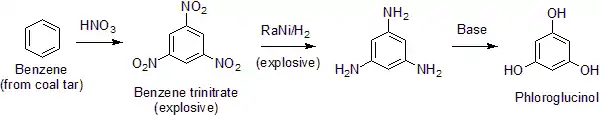 Отримують відновленням 1,3,5-тринітробензену з подальшим гідролізом:
