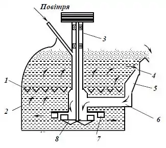 Флотаційна машина з киплячим шаром належить до механічних флотомашин і за конструкцією відрізняється тим, що: по-перше, усередині камери на висоті 500—550 мм від дна камери 2 встановлюється решітка 1 з кутків, живий перетин щілин якої становить 18—20 % усієї її площі; по-друге, на передній стінці камери із зовнішньої або внутрішньої сторони встановлюється жолоб 5 постійного перетину, який з'єднаний трубою 6 з ковпаком надімпелерної труби 3. Жолоб служить для відбору через щілину 4 циркуляційного потоку на імпелер з верхньої зони камери.
