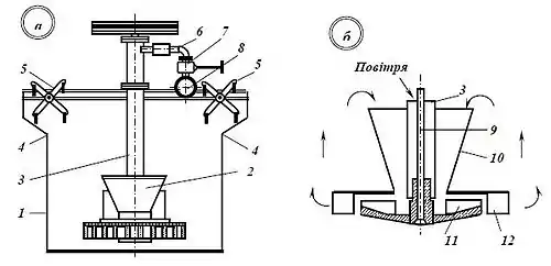 (1 — корпус камери; 2 — блок-аератор; 3 — повітряна труба; 4 — зливний поріг; 5 — пінознімач; 6 — патрубок; 7 — засувка; 8 — колектор; 9 — вал імпелера; 10 — конус-диспегатор; 11 — імпелер; 12 — статор).
