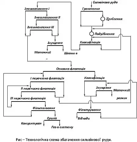 Технологічна схема флотаційного збагачення сильвінових руд (рис. ) має деякі особливості. Сильвінові руди відрізняються невеликою твердістю і значною крихкістю, тому для зменшення переподрібнення руди її дроблення і подрібнення виконується в обережному режимі. Для дроблення застосовуються щокові і молоткові дробарки, перша стадія дроблення виконується в шахті (в щоковій дробарці), тому на фабрику руда надходить крупністю не більше 200 – 250 мм.