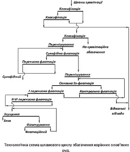 Звичайно корінні олов'яні руди збагачуються за складними багатостадійними схемами з використанням не тільки різних гравітаційних апаратів, але й магнітних сепараторів, флотаційних машин. У технологічних схемах збагачення корінних олов'яних руд розрізняють основний, промпродуктовий, хвостовий, шламовий і доводочний цикли.