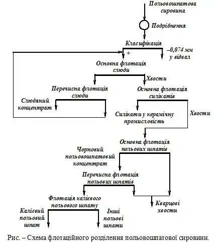 Відповідно до розглянутої технології руда дробиться до 20 – 25 мм і подрібнюється в стержневих млинах до крупності 0,6 – 0,8 мм. З подрібненої руди видаляється клас –0,074 мм, що є відвальним про-дуктом. Піски (клас +0,074 мм) послідовно проходять цикли флотаційного збагачення слюди, силікатів, польових шпатів, а також цикл розділення польових шпатів (рис. ).