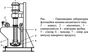 Лабораторні дослідження флотованості мінералів проводять у однокамерних лабораторних флотаційних машинах механічного типу (рис. 2). Найбільше розповсюджені флотаційні машини ФМ-1М, що випускаються серійно. Машини обладнані типорозмірними імпелерами та знімними камерами місткістю 0,25; 0,5; 0,75; 1; 1,5; 3 л, що дозволяє випробовувати флотаційні схеми з великим числом операцій в одній машині. Для вихідного матеріалу рекомендується застосовувати машину з місткістю камери не менше 1 л. Перед завантаженням матеріалу камеру флотомашини промивають водою, закривають трубку підводу повітря, вмикають електродвигун, виливають пульпу у камеру і перемішують її. Потім добавляють у визначеному порядку реагенти, перемішують з ними пульпу протягом необхідного часу і впускають повітря. Якщо рівень пульпи виявився низьким, у машину додають воду у такій кількості, щоб пінознімач торкався рівня пульпи.