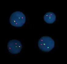 Інтерфазні клітини, в яких візуалізовано хромосомна перестановка t(9;22) за допомогою FISH