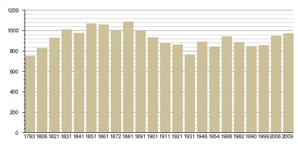 Динаміка населення (base Cassini de l'EHESS pour les nombres retenus jusque 1962[3], base Insee à partir de 1968 (population sans doubles comptes puis population municipale à partir de 2006)[4] · [5] ):