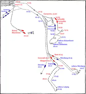 Німецька ескадра (2 броненосних і 3 легких крейсери, 2 транспорти і госпітальне судно), що виконувала свою задачу по відволіканню значних сил британського флоту, отримала наказ прориватися до Німеччини. Не маючи даних розвідки про дислокацію та переміщення британських бойових кораблів, адмірал фон Шпеє вирішив завдати на останок удару по англійській військово-морській базі Порт-Стенлі на Фолклендських островах, де за його даними був лише застарілий ескадрений броненосець «Канопус»[а 11]. Але, несподівано для німецького адмірала, виявилося, що до ВМБ на островах в переддень цього прибула окрема британська ескадра (2 лінійних, 3 броненосних і 2 легких крейсери, 1 допоміжний крейсер) під прапором віце-адмірала Д.Старді.