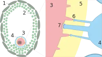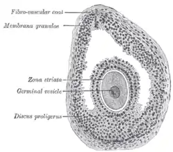 У фолікулі міститься ооцит 1-го порядку. Ядро ооцита називають «зародковий пухирець» (germinal vesicle). Ооцит оточений шаром глікопротеїнів, це zona pellucida (zona striata). Він, у свою чергу, оточений шаром гранульозних клітин. Гранульозні клітини оточені тонким шаром позаклітинного матриксу — базальною мембраною (на малюнку позначена, як fibro-vascular coat). Навколо базальної мембрани знаходяться клітини теки.