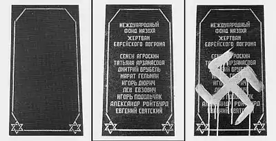 Проєкт був представлений в Українському Домі в рамках виставки «Київська мистецька зустріч. Нове мистецтво Польщі, Росії, України» (1995). Перед відкриттям виставки Національна гвардія України зруйнувала експозицію ФМ[20][28], мотивуючи свої дії «боротьбою з антисемітизмом», а дирекція закрила виставку, заборонила присутність преси.