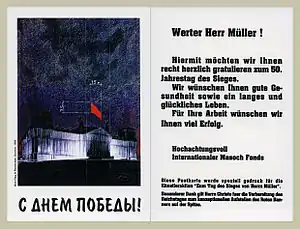 8 травня 1995 року, Берлін. Поштова акція[25]. Об'єкт: поштова картка. 5500 Мюллерів[4] (власників найбільш поширеного і знакового німецького прізвища), які проживали у Берліні, отримали до 8 травня (50-річчя перемоги у II Світовій війні) поздоровлення Фонду Мазоха «З Днем Перемоги»[8].