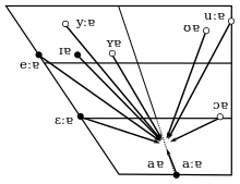 - /а:/ описується або як неогублений голосний середнього ряду низького піднесення [[[|äː]]][4][5][6][12][13] або як неогублений голосний заднього ряду низького піднесення [ɑː].[7][18] Через це він іноді подається в транскрипції як /ɑː/. [19]