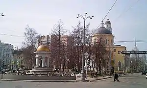 Цікаве класичне вирішення ротонди — на гранітному постаменті встановлені колони доричного ордера з сірого каррарського мармуру, спеціально доставленого з Італії, а на високому антаблементі встановлено напівсферічний золотий купол, що має символізувати Церкву Вознесіння Господнього.