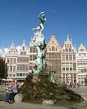 Фонтан Брабо прикрашає площу Гроте Маркт. Поряд розташована Антверпенська ратуша.