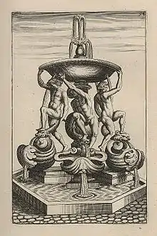Фонтан складається з квадратного басейну з кулею воготовленою з африканського мармуру на постаменті в центрі. Навколо кулі поміщені чотири головки Путто, з яких у басейн тече вода. На чотири боки басейну розташовані мармурові раковини. Навколо кулі розташовані чотири бронзових юнаки що відпочивають та закидають одну ногу на голови бронзових дельфінів, щобтримаючись за хвіст дельфінів дотягнутися до верхньої чаші з іншими дельфінами. Вода ллється з ротів дельфінів у раковини, а звідти в нижній басейн.