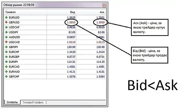 Таким чином, по Ask дається котирування на купівлю учасником ринку базової валюти, по Bid дається котирування на продаж учасником ринку базової валюти.