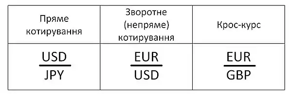 Види валютних котирувань на ринку Форекс - Зворотне (зрідка — непряме) котирування — котирування, що показує, яка кількість доларів США міститься в одиниці національної. Наприклад, GBP/USD = 1.9700. Це означає, що за 1 британський фунт можна одержати 1,97 доларів США.