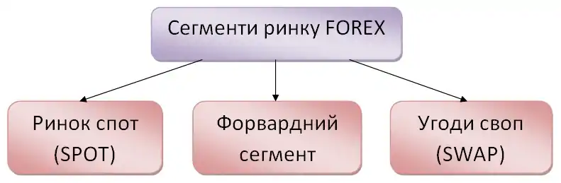 | Ринок спот — безпосередньо ринок Форекс — ринок міжбанківських операцій без єдиного центру торгівлі | Форвардний сегмент — операції з похідними інструментами, реєструються на біржових та позабіржових організованих торговельних майданчиках | Угоди своп — комбіновані операції на безпосередньому ринку та/або з похідними інструментами |