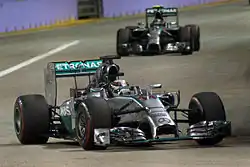 - Система рекуперації кінетичної енергії, відома з 2009 по 2013 рік, як KERS, перейменована в 2014 році на ERS-K.[95] Оновлена система включена в конструкцію двигуна як додаткове джерело живлення. Система рекуперації енергії (ERS) перетворює не лише кінетичну, але й теплову енергію на електричну.[96][97] Система ERS приймає тепло відпрацьованих газів за допомогою MGU-H і зберігає його в акумуляторах, як електричний заряд. При необхідності з акумуляторів заряд передається на MGU-K, який підключається безпосередньо до трансмісії, щоб доставити додаткову потужність в найбільш прямий і ефективний спосіб.[97][98] ERS-K дає водіям додатково 161 к.с. протягом тридцяти трьох секунд на колі, для порівняння, блоки KERS, які використовувалися до 2014 року, дали водіям 80 к.с. протягом шести секунд на колі.[92]