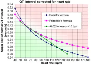 де QTc(н) — належний QTc, а k — коефіцієнт, що становить 0,37 для чоловіків, 0,39 для жінок та 0,38 для дітей.