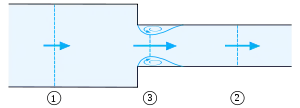 У випадку раптового зменшення діаметра труби, потік не в змозі відтворити перехід до профілю вузької трубу. У результаті спостерігається зрив потоку, що приводить до появи завихрень біля входу у вузьку трубу. Основний потік спочатку звужується у перерізі 3, а потім знову розширюється, щоб покрити всю область труби у перерізі 2.