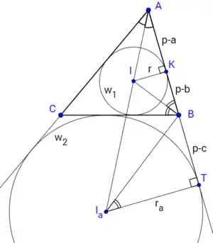 Нехай — точка дотику вписаного кола до сторони , а — точка дотику зовнівписаного кола до продовження сторони . Тоді — радіус вписаного кола , — радіус зовнівписаного кола , і нехай — півпериметр трикутника ..
