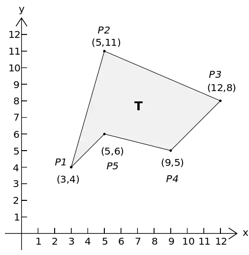 Розглянемо багатокутник, наведений на рисунку й заданий (3,4), (5,11), (12,8), (9,5), (5,6):