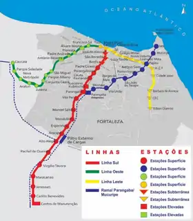 В місті 3 діючіх ліні; Південна лінія — метрополітен, Західна лінія — працює як приміська залізниця, Лінія «Parangaba-Mucuripe» — легке метро.