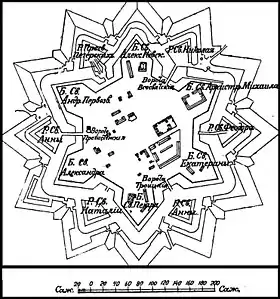 У фортеці було троє воріт, облаштованих сторожовими вежами та кордегардіями — Троїцькі (головні, тепер виїзд на Ново-Олексіївку), Пречистенські та Всіхсвятські. Бастіони фортеці названі іменами святих — Петра (перший від Троїцьких воріт за стрілкою годинника), далі послідовно — Олексія, Андрія Первозваного, Олександра Невського, Архістратига Михаїла та Катерини. Равеліни також мали святих покровителів — Анни (навпроти Троїцьких воріт), потім по колу — Наталії, Іоанна, Пресвятих Печерських, Миколая та Феодора.