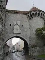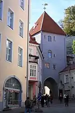 | 18 | Pikk | Suur Rannavärav | ![]() | Великі морські ворота — збереглися зовнішні ворота зі сторожовою вежею (XVI століття), внутрішні (старі) ворота в чотирикутній вежі не збереглися. Прообрази таких парних веж укріплених воріт у Нідерландах і на Нижнього Рейні. |