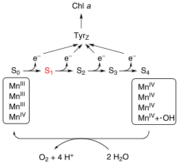 Послідовність реакцій представляється наступним чином. TyrZ окиснюється і відновлює П680+. Окиснення тирозин а йде з утворенням нейтрального радикала (TyrZ•), що вказує на спряженість процесу зняття електрона від гідроксила тирозину з процесом передачі його протона на акцептор. Як акцептори протона можуть виступати залишки гістидину H190 і глутамінової кислоти E189 білка D1, розташовані поблизу тирозина-161. Далі протон може бути переданий по ланцюжку амінокислот до люменальной поверхні мембрани, де відбувається його викид у люменальний простір. Тирозин ж відновлюється за рахунок роботи марганцевого кластера та окиснення води: утворився нейтральний радикал TyrZ• відриває атом водню від молекули води, пов'язаної з атомами марганцю в кластері. Тільки один з іонів марганцю, а саме четвертий Mn, пов'язує молекулу води як субстрат і забирає від неї електрони. Передбачається, що безпосередньо перед формуванням O=O зв'язку четвертого Mn переходить у стан Мn+5 . У цьому випадку O=O зв'язок може бути утворена за рахунок нуклеофільної атаки на електрон-дефіцитний комплекс Мn+5=O другою молекулою води, яка пов'язана із прилеглим іоном кальцію. Повне окиснення води й утворення кисню вимагає чотириразового повторення описаних подій [19].