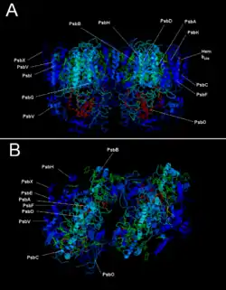 Білок ядра фотосистеми I А гомологічний білкам D1+СP43 (молекулярна маса білка А відповідає сумі молекулярних мас білків D1 і СP43) з фотосистеми II, а білок В гомологічний білкам D2+CP47 відповідно[14].