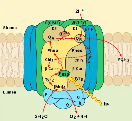 Головна відмінність фотосистеми II від фотосистеми I — це наявність великого зверненого в люмен домену, який складається з марганцевого кластера та оточувальних його захисних білків. Саме тут відбувається процес фотохімічного окиснення води, супроводжуваний виділенням кисню і протонів[4].