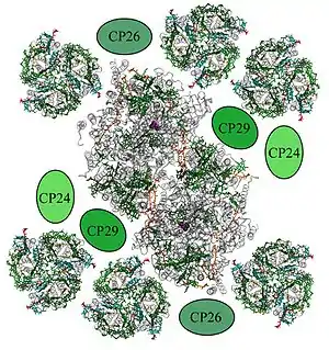 Внутрішня антена фотосистеми II складається з двох кодованих хлоропластним геномом білків — CP43 і CP47, які впритул примикають до центрального гетеродімери D1/ D2(CP43 розташовується поблизу D1, а CP47 — близько D2). Білок CP43 асоційований з 13 молекулами хлорофілу а і 3-5 молекулами β-каротину. CP47 несе 16 молекул хлорофілу а і 5 молекул β-каротину. З цими антенами контактують зовнішні «мінорні» антени: CP29, CP26 і CP23, також відомі як Lhcb4-6, причому CP26, CP29 і СЗКII знаходяться в контакті один з одним. Кожен з цих білків містить по 18 молекул хлорофілу а, 9 молекул хлорофілу b і 6 молекул каротиноїду[22]. Завдяки своєму становищу мінорні білки здійснюють функцію регулювання стоку енергії від зовнішніх антен на реакційний центр ФСII. Саме в мінорних білках протікає віолоксантиновий цикл, який грає фотопротекторну роль при надмірному освітленні та допомагає підготувати рослину до зміни дня і ночі[23].