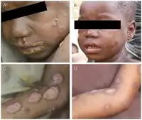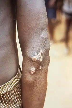 ![]() Фрамбезійні вузлові ураження на лікті хворого Фрамбезійні вузлові ураження на лікті хворого | |
