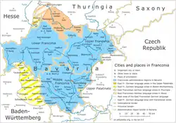 | Франконія (блакитна) і землі, де поширена східно-франкська (жовтий і помаранчевий) | |||||