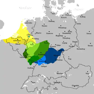 - ріпуарські (Ripuarisch) (Велика територія Кельн — Бонн — Аахен, Бергіш-Гладбах, Леверкузен, нижня течія річки Зіґ та південна Гірська земля, частина Нордейфеля та місцевість до Неєнара (Рейнланд-Пфальц), північна німецько-східна Бельгія, в Голландії міста Керкраде, Бохольт та Ваалс).