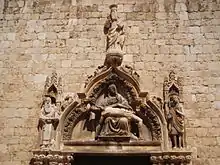 Єдиним вцілілим після землетрусу 1667 року елементом церкви виявився готичний портал 1498 року, виходить на Страдун та грає роль головного входу до церкви. Цей портал був створений у місцевій майстерні братів Леонарда і Петра Петровичей, його центральна частина являє собою люнет над вхідними дверима з образом П'єти. П'єта оточена фігурами святого Ієроніма та Іоанна Хрестителя, над люнетом — постать Бога-Батька[4]. Після землетрусу церква була відновлена в бароковому стилі. Головний вівтар зі скульптурою Христа Воскреслого в оточенні чотирьох мармурових витих колон був створений у 1713 році, п'ять бічних вівтарів — венеціанцем Джузеппе Сарді (1684—1696). Над прикрасою вівтаря св. Франциска працював у 1888 році відомий хорватський художник Целестин Медович. У церкві похований поет Іван Гундулич[5].
