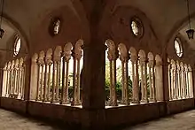 Монастир має два клуатра: верхній (відноситься до житлової частини монастиря і недоступний туристам) і нижній (романський з рисами готики). Романський клуатр багато декорований різьбленими колонами, створений бл. 1360[4]. Колонада складається з парних восьмикутних колон, кожна капітель відрізняється від сусідньої, зображуючи людські голови, тварин, квіткові мотиви і т. д. Клуатр налічує 120 колон та 12 масивних пілястр. У 1860 році клуатр був прикрашений фресками із зображеннями життя святого Франциска. У центрі розташований фонтан зі статуєю святого Франциска.