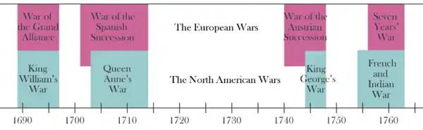 | 1689–1697 | Війна короля Вільгельма 1-я міжколоніальна війна (у Квебеку) | Війна Аугсбурзької ліги | Риквіцький мирний договір |