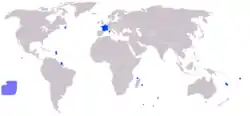Володіння: в Америці — Гваделупа, Французька Гвіана, Мартиніка, Сен-Бартельмі, Сен-Мартен (Центральна Америка), Сен-П'єр і Мікелон (поблизу південно-східного узбережжя Ньюфаундленду); в Африці — Реюньйон та Майотта (біля південно-східного узбережжя); 5 заморських територій: в Океанії — Нова Каледонія, Французька Полінезія, до складу якої входять острови Товариства, Маркізькі острови, архіпелаг Туамоту, Тубуаї, острови Гамб'є; острови Волліс і Футуна, розташовані на екваторі, в південно-західній частині Тихого океану між Фіджі та Самоа; Кліппертон. Французькі Південні та Антарктичні Території розташовані на півдні Індійського океану. Завдяки цьому Франція є третьою державою світу (після США і Великої Британії) за розмірами заморських володінь.