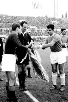 | Капітан «Лаціо» Франческо Янич (праворуч) перед грою проти «Роми», 1960 рік. | ||||||||||||||||||||||