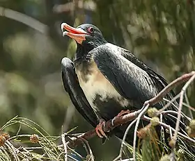 Тіло завдовжки 66-81 см, розмах крил — 175—193 см. Самці важать 625—875 г, самиці — 760—955 г. Оперення чорного забарвлення з зеленкуватим, синюватим або фіолетовим відтінком. У самців є червоний горловий мішок. У самиць на грудях є біла пляма та білий комір на шиї.