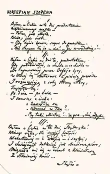 | Нам забороняли Словацького, Красінського, Міцкевича, але не заборонили Шопена. Однак у Шопені міститься все, в чому нам відмовлялося: і барвистий одяг, пояси з чистого золота, похмурі капелюхи, краківські рогаті капелюхи, благородний брязкіт мечів, відблиски кіс наших селян, стогони поранених грудей, бунт скутого духу, хрести на цвинтарі, придорожні каплички, молитви засмучених, біль неволі, смуток свободи, прокляття тиранів і радісна пісня перемоги [...]. |