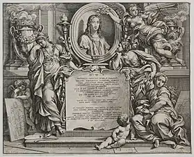 Карло Маратті та П'єтро Аквіла. «Алегорія слави Рафаеля Санті», бароковий фронтиспис до видання про розписи Лоджий Рафаеля в Ватикані.
